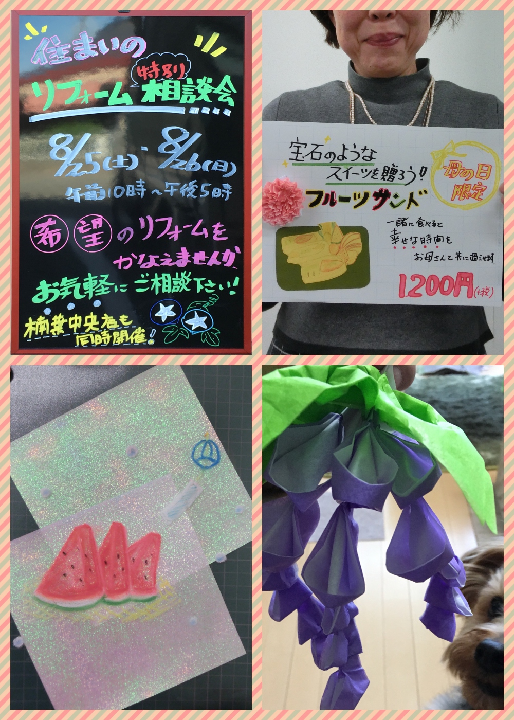 『皆さんの作ったPOP』のギャラリー_2(随時更新中!) ギャラリー_2 《「POPとアート文字カフェ」》 では、次はM.Nさんの作品です! ほんわかした笑顔がチャームポイントのムードメーカーさん。パソコンでのPOP制作も得意です。「ブラックボードに挑戦したい!」と初年度に入会されました。じっくり取り組む姿勢が着実な進歩を支えています。 「ポスターの画像を送ります」とのメール添付からブラックボードへも意欲的に挑戦される日々が始まりました。teruterupopもアドバイスを差し上げながら、こちらも勉強させて頂いています。 左上には、文字のミスがありました。皆さんは気付かれましたか?分かっていても、作品作りに集中していると見過ごしがちです。街で見かけるボードにも見つけられる時が多いです。teruterupopの助成金事業にも作品提供頂きました。その事業のギャラリーの受付でパチリ(左下)ご協力をありがとうございました。 クラフトがテーマの活動日に「鯉のぼり」を作ってみました。いろんな作り方があって楽しかったですね。早速、勤め先の店舗で登場ですね!すぐ活用する事が大切です。角ペンのエッジに、課題が残りますが、全体的に進歩しているのは確かです。期待しています! キットパスに慣れましたね。ブラックボードにイラストを描く時に、大いに役立ちます。美味しそうなスイカがすぐ描けましたね。これからもいろんなイラストに挑戦して下さい、かき消しが簡単な安全素材で作られているので、お子さまにもおすすめです。ボリュームある「藤の花」は慣れるといくつでも作りたくなりますね。材料も身近で助かるクラフトです。ワンちゃんが興味津々♪ ← Backメッセージが送信されました お名前(必須) 警告 メールアドレス(パソコンメールの受信許可をお願いします)(必須) 警告 お問合せ内容(詳しくお願いします)(必須) 警告 警告 送信 Δ 共有: Email a link to a friend (新しいウィンドウで開きます) メールアドレス Share on Pinterest (新しいウィンドウで開きます) Pinterest Facebook で共有 (新しいウィンドウで開きます) Facebook X で共有 (新しいウィンドウで開きます) X いいね 読み込み中…