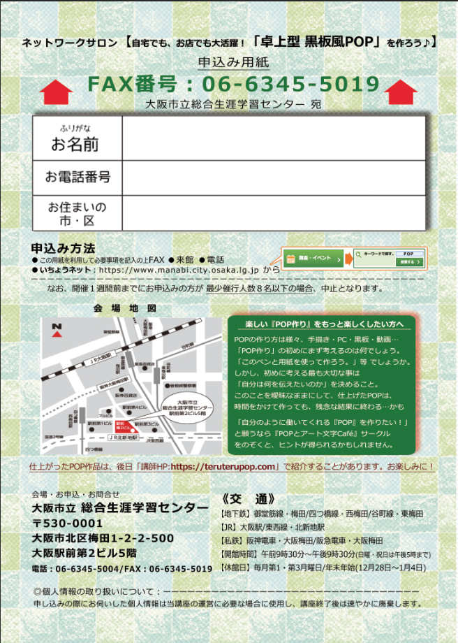 大阪総合生涯学習センター主催の、充実したコスパ抜群の「体験版 POPセミナー」は毎年1回「9月頃」行われ、今回も無事終了しました。ありがとうございます!