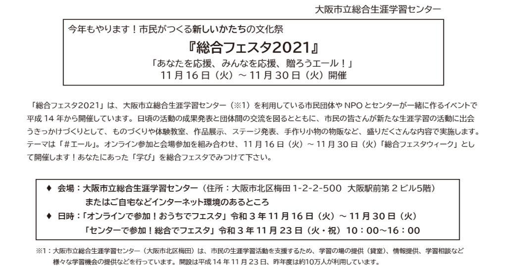 大阪市立総合生涯学習センターでは、従来のセンター内でのフェスタに加えて、自宅のパソコンやスマホでも楽しめる『おうちでフェスタ♪』も行います♪